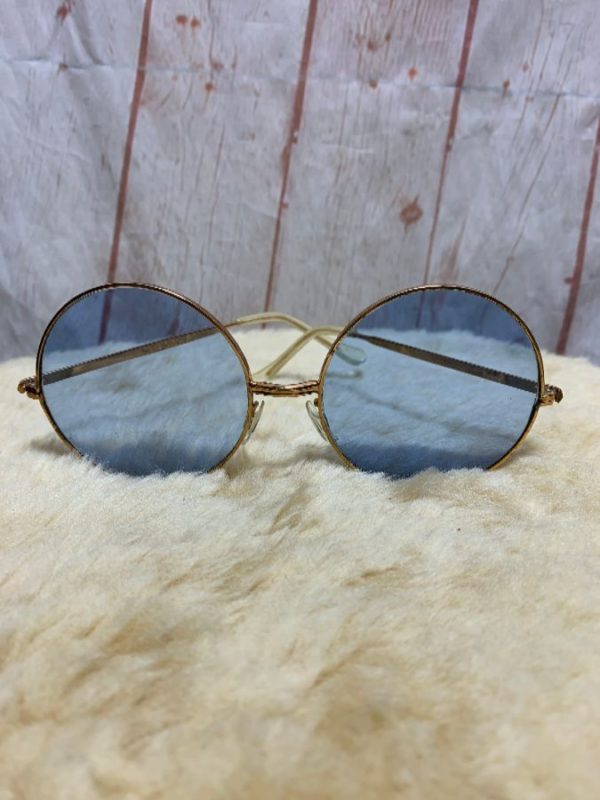 1960’s-70’s sunglasses, round shaped, brass wire rim frames, cool colored lenses, oversized, dead-stock, brass/pale blue
