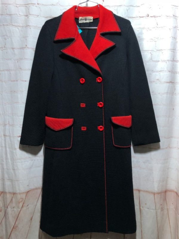 1960’S CLASSIC RENATA BOUTIQUE COAT, KNIT, BUTTON-UP, DOUBLE BREASTED, MOD PEACOAT STYLE, TWO TONED COLOR SCHEME, CONTRASTING COLLAR/BUTTONS/POCKET FLAPS, BLACK/RED