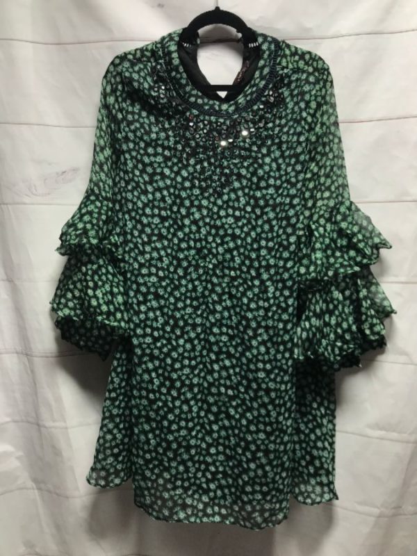 1960’s Ranna Gill dress, chiffon, pullover, long ruffled sleeves, button-up neck in back, tiny floral pattern print, embroidered sequin embellishment, teal green, size XL
