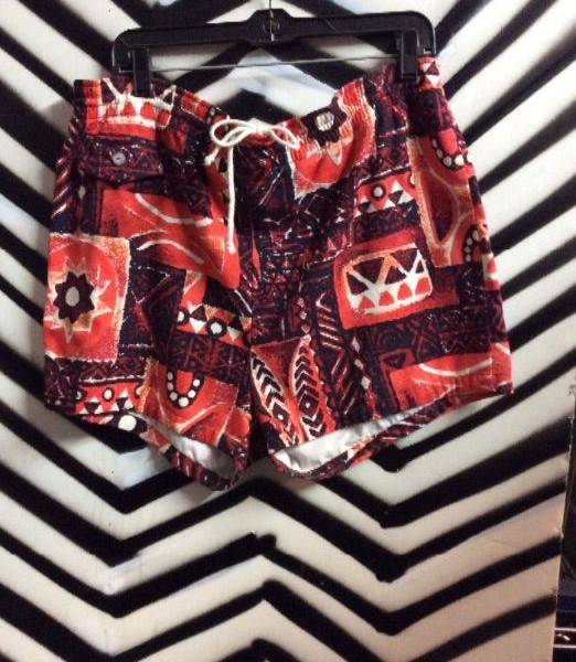 Vintage 1960’s Hawaiian print swim trunk shorts, red/black/white multi-color print design