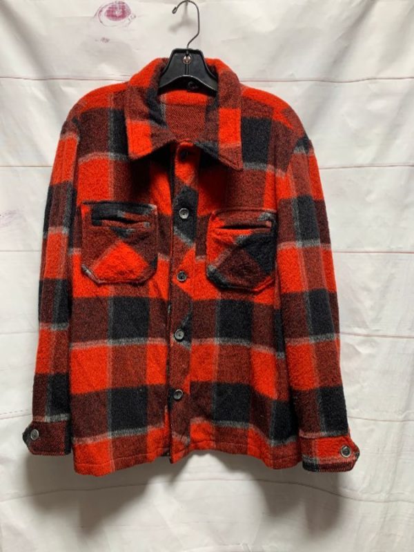 1960’S STILTON FLANNELS JACKET, THICK WOOL, LONG SLEEVES, BUTTON-UP, PLAID DESIGN, RED/BLACK, SIZE L