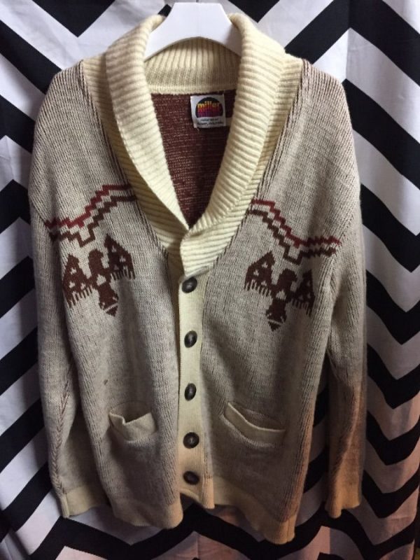 1970’s Cowichan sweater, button-up, front pockets,Thunderbird design on front chest and full back, creme/burgundy, size L