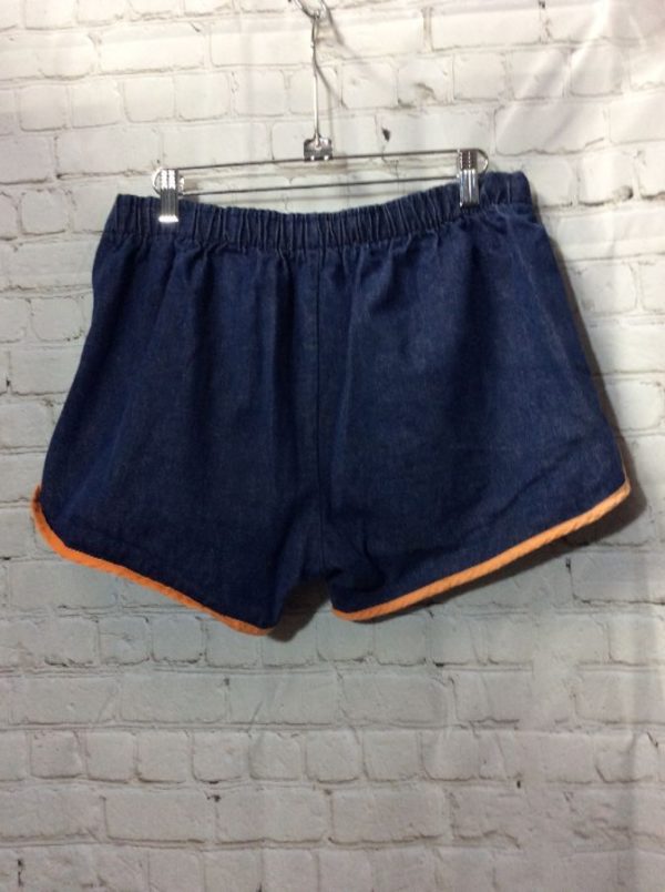 1970’s denim shorts, elastic waist with drawstring, dolphin cut, binding trim, blue/orange, size adjustable