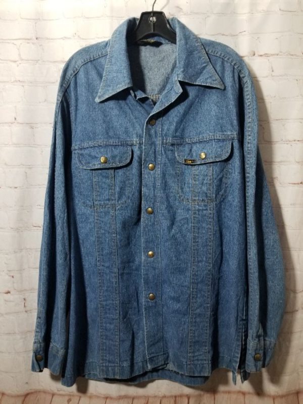 1970’s Lee denim shirt, long sleeves, button-up with solid brass snaps, thick fabric, 2 front pockets with snaps, acid washed, medium blue, size L