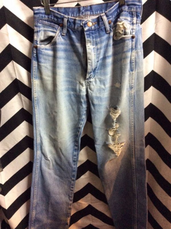 1970’S WRANGLER DENIM JEANS, PERFECTLY DISTRESSED, HOLES, MEDIUM BLUE, SIZE 31″W X 34″L