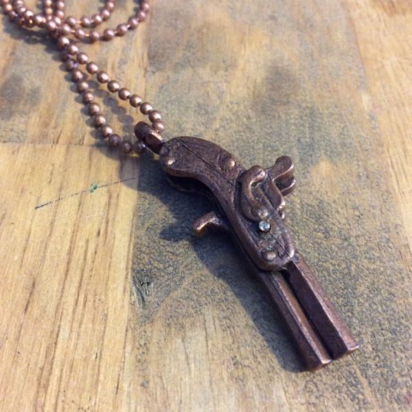 1970’s necklace, roach clip, metal copper pistol, ball chain, copper colored
