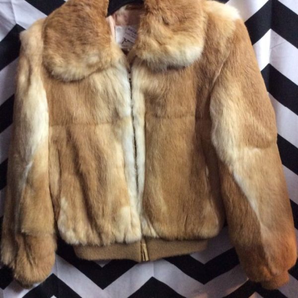 1970’S BOMBER JACKET, ZIP-UP, RABBIT FUR, LINED, WHITE/TAN, SIZE M