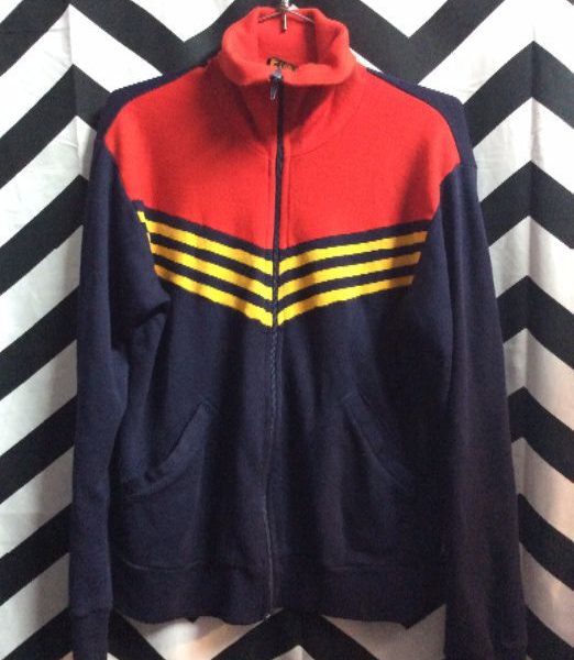 1970’s retro sweater, zip-up, color block & stripe design, red/yellow/navy as is
