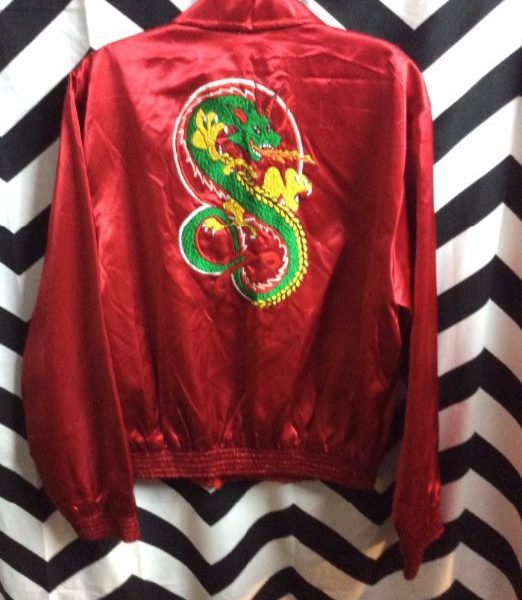 1970’s bomber jacket, satin, embroidered dragon & name/Steve, red/green, size M