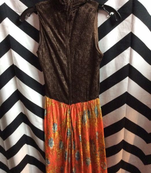 1970’s dress, sleeveless, floral print polyester skirt, velvet top, brown/orange