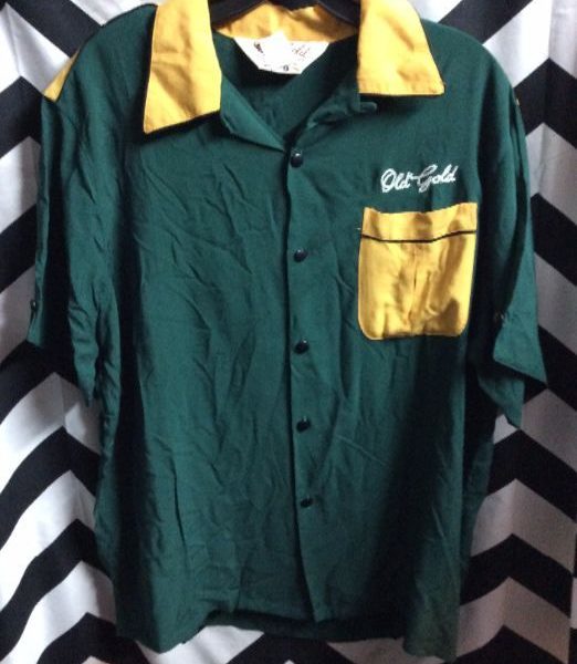 1970’s Bowling shirt, short sleeve, button-up, Old Gold Lanes embroidered in chain stitch, green/yellow