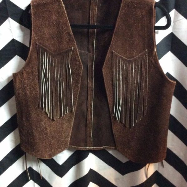 1970’s vest, leather, suede, open front, lace-up lower sides, fringed front and back, chocolate, size M