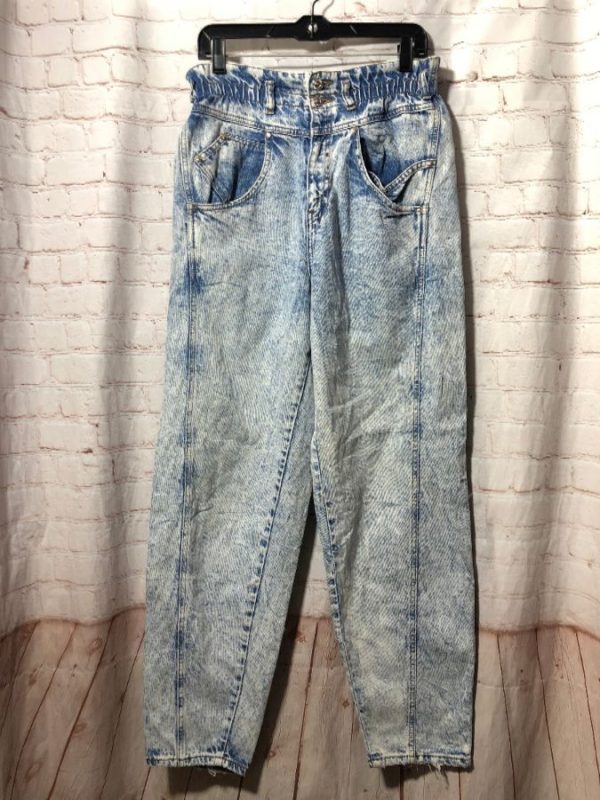 1980’s Levis denim jeans, cotton, elastic waist with belt loops, front & back pockets, acid wash with marbled look, medium blue, size 32W