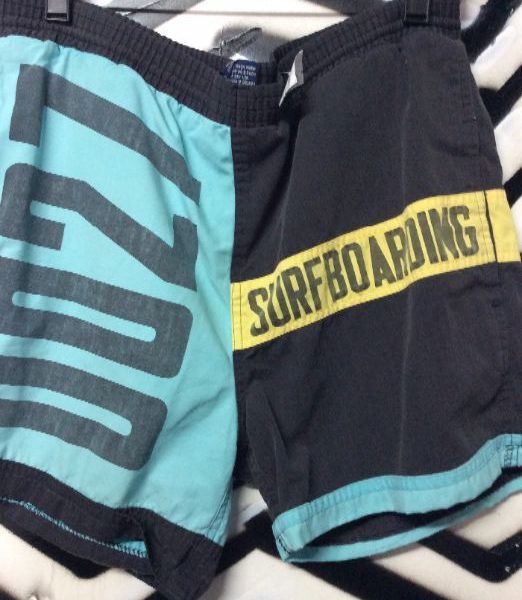 1980’s-1990’s swim trunks, color block design, 0027 & Surfboarding screen printed graphics, black/turq, size adjustable
