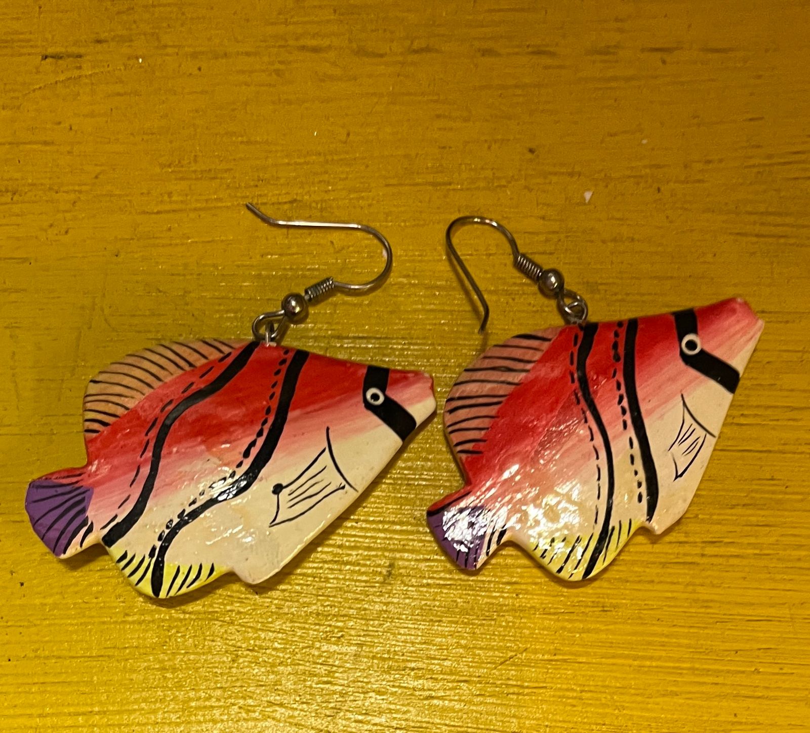 1980S-90S HAND-PAINTED WOODEN ANGEL FISH HOOK EARRINGS COLORFUL DESIGN