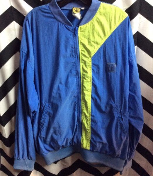 1980’s – 1990’s Body Glove windbreaker jacket, zip-up, neon color block design, neoprene cuffs, screen print logo full back, periwinkle-blue/neon-yellow, size XL