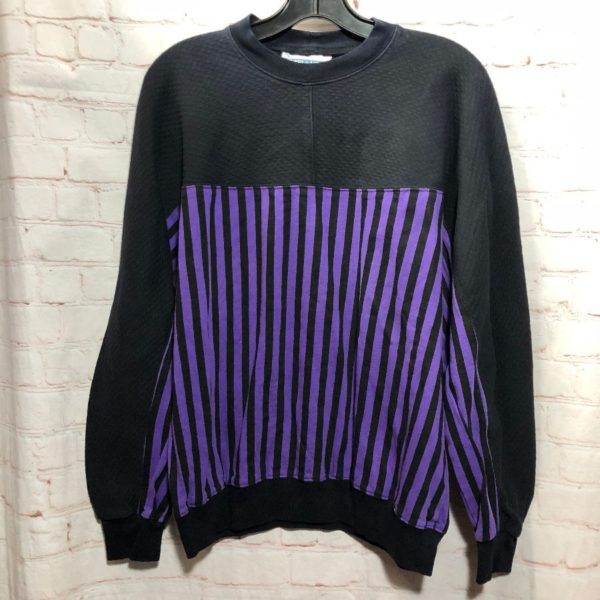 1980’s-90’s Beverly Hills Polo Club sweatshirt, cotton, pullover, crew-neck, vertical stripe pattern, color-block design, black/purple, size M small fit