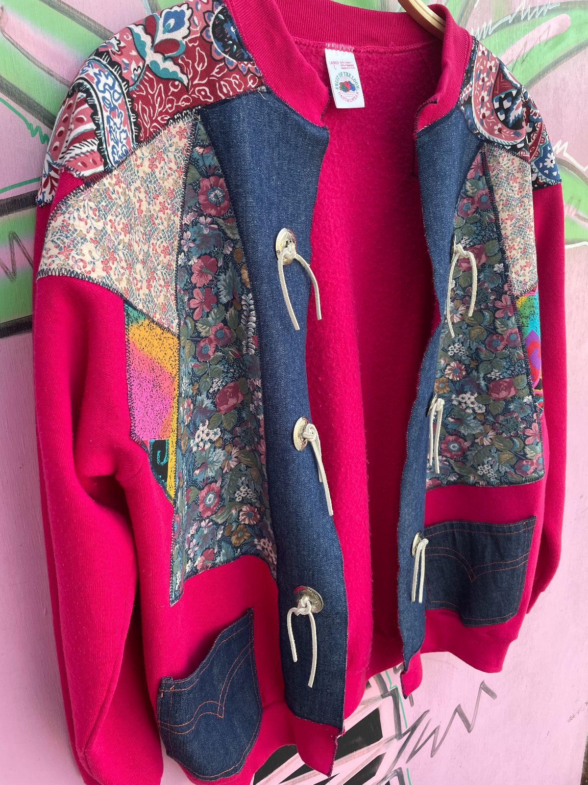 1980S-90S UPCYCLED! DENIM & PATCHWORK OPEN CARDIGAN SWEATSHIRT, CONCHO BUTTONS