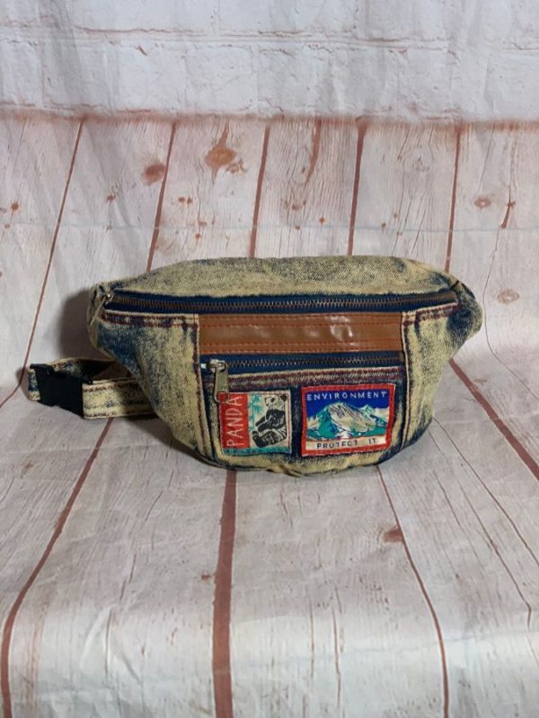 1980S ACID WASHED STONE WASHED FANNY PACK WITH STAMP PATCHES & LEATHER TRIM *AS-IS