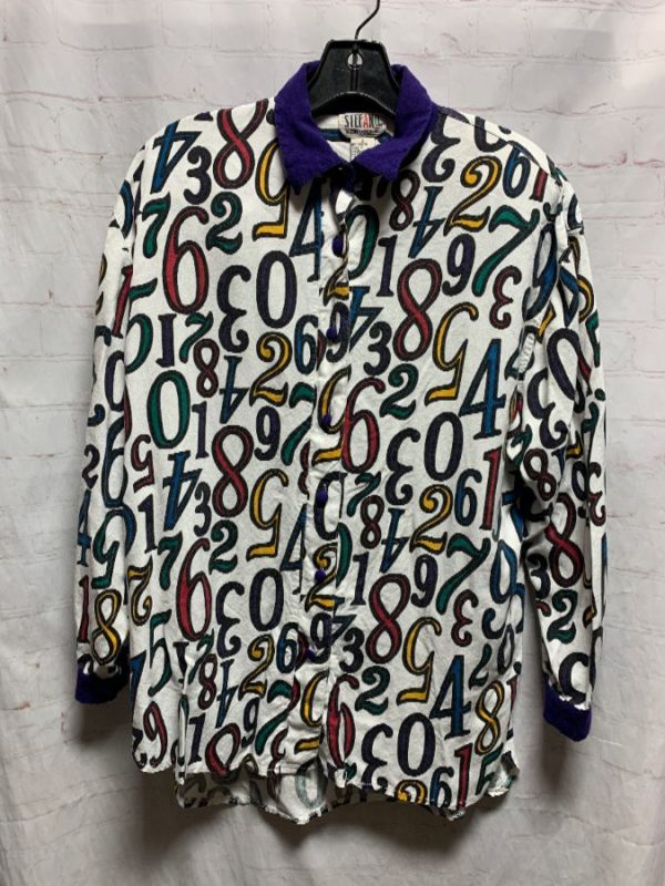 1980’s Stepano blouse, rayon, long sleeves, button-up, shoulder pads, allover numerical print, white/black/yellow/navy blue/blue/red/green, size S
