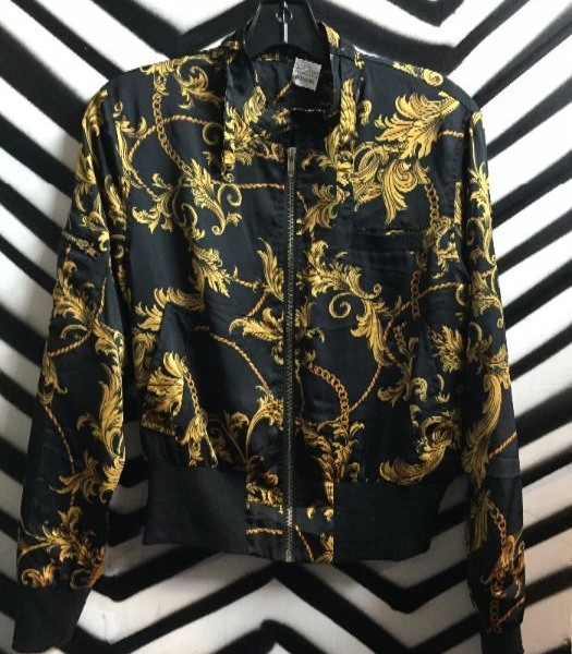 1980’s bomber jacket, zip-up, Baroque print design, black/gold, size S small fit