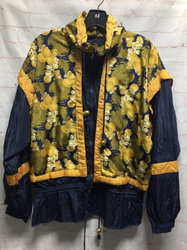 1980’S ARGEE SPORTS WINDBREAKER JACKET, ZIP-UP, QUILTED TRIM, CINCHED AT BOTTOM, COLOR-BLOCK DESIGN, LEAF AND FRUIT PRINT FRONT SECTION, NAVY-BLUE/GOLD/WHITE/TAN, SIZE M