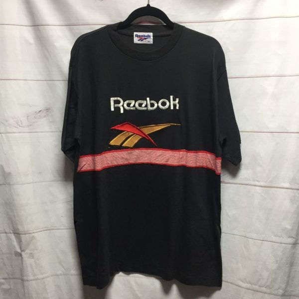 1980’S CLASSIC REEBOK T-SHIRT, HORIZONTAL STRIPE ACROSS MIDDLE FRONT, EMBROIDERED LETTERING & APPLIQUED PATCHWORK LOGO, DEAD-STOCK, BLACK, SIZE XL