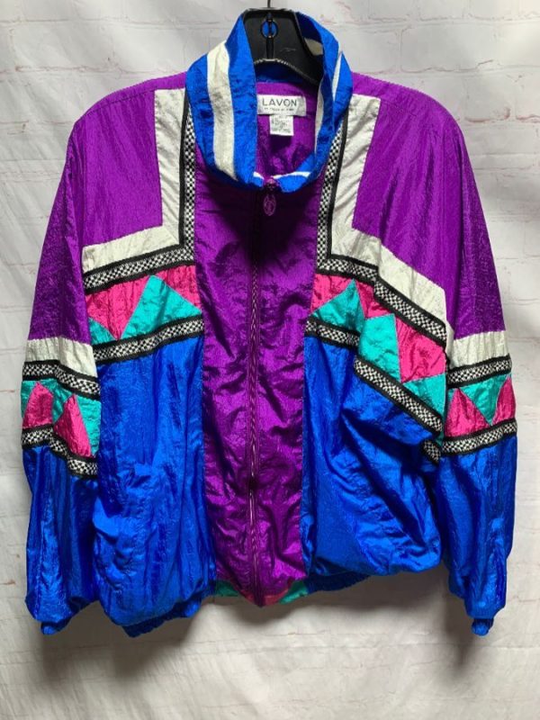 1980’s Lavon windbreaker jacket, nylon, zip-up, geometric pattern in color-block design, checkered ribbon detail, purple/blue/white/black/pink/turquoise, size M