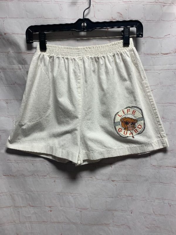 1980’s shorts, cotton, elastic waist, screen printed Teddy Bear Life Guard with life preserver graphic, white/brown/red/black, size S
