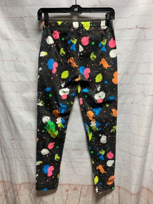 1980’s Princess stretch pants, cotton, elastic waist, skinny fit, neon colors, splatter paint design, black/orange/neon green/neon pink/neon blue/yellow/white, size S