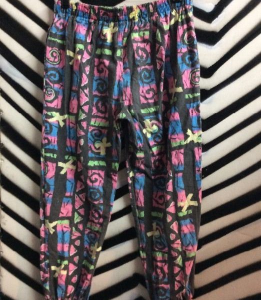 VINTAGE 1980S COTTON BEACH PANTS – TAPERED W/NEON PRINTED DESIGN