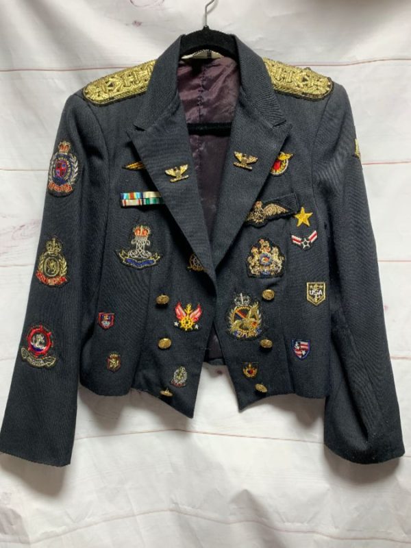 1980’s Vedo Verde military blazer, cropped, open front, collar, lapels with eagle pins , embroidered epaulets, embroidered all over patches and large back crest design, black/multi-color, size M