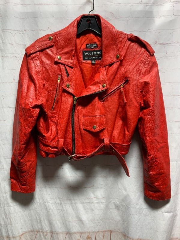 1980’s Wilson’s Leather motorcycle jacket, cropped, leather, off-set front opening, zippered front, Thinsulate, belted at waist, shoulder epaulets, single snap-up pockets & 2 zip-up front pockets, red, size L