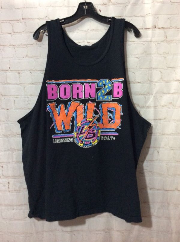 1980’s tank top, Born 2 B Wild, screen printed lettered design with lighting bolt, dead-stock, black/pink/orange/blue, size L