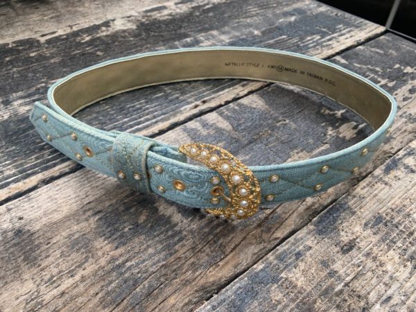 1980’S DENIM BELT, QUILTED STITCHING WITH PEARL DETAIL, ORNATE BUCKLE WITH INSET PEARLS, MEDIUM BLUE/GOLD, SIZE M AS IS