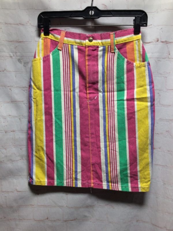 1980’S DENIM SKIRT W/ PASTEL COLORS & VERTICAL STRIPES HIGH WAIST MID LENGTH