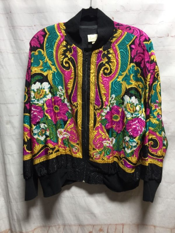1980’s Jordana windbreaker jacket, zip-up, shoulder pads, knit collar/cuffs/hem, funky floral Baroque print, teal/purple/gold/white/black, size M