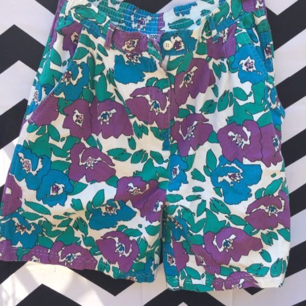 1980’S SHORTS, COTTON, HAWAIIAN STYLE FUNKY PRINT, WHITE/GREEN/BLUE/PURPLE, SIZE 12