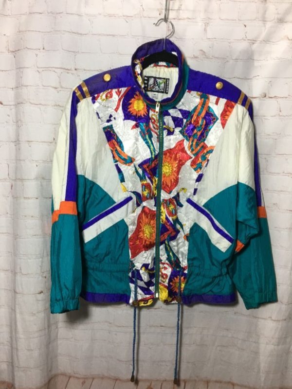 1980’s RE Sport/River Edge windbreaker jacket, zip-up, shoulder pads, decorative button on shoulder, cinched waist, funky nautical print, color-block design, front pockets, white/purple/teal/orange/yellow/blue/gold, size M As is