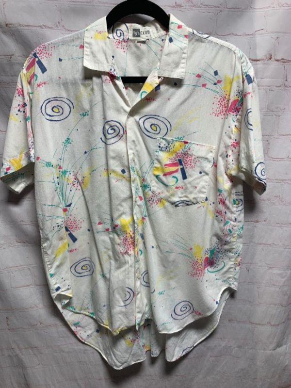 1980’S 15’S CLUB BLOUSE, SHORT SLEEVES, BUTTON-UP, HIGH LOW HEM, FRONT CHEST POCKET, FUNKY ABSTRACT PRINT, PASTEL COLORS, WHITE/PINK/TURQUOISE/YELLOW/BLUE, SIZE L AS IS