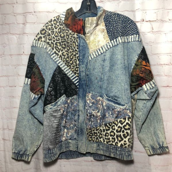 1980’S FUNKY PATTERN PATCHWORK ACID WASH DENIM ZIP-UP JACKET