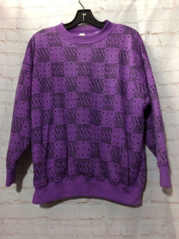 1980’s Variations sweatshirt, pullover, crew-neck, puffy, funky square print, purple/black, size M