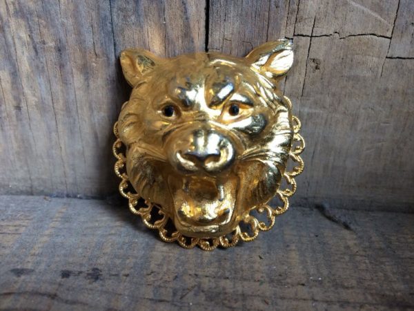 1980’S GOLD METAL PLATED ROARING TIGER HEAD BROOCH
