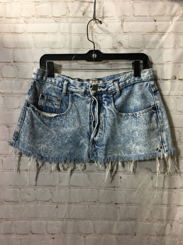 1980’s Guess jean skirt, super short mini, button-up fly, acid washed, embellished with studs, medium blue, size 3