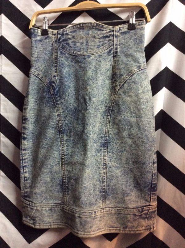 1980’S DENIM SKIRT – HIGH WAISTED – EXTRA LONG BACK ZIPPER – ACID WASH
