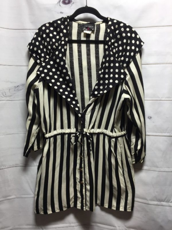 1980’s Dina Bar-El jacket, rayon, button-up, hooded, drawstring at waist, vertical stripes with polka dot hood, black/white, size one size
