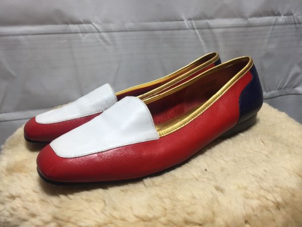 1980’s Enzo Angiolini shoes, leather, flats/loafers, color-block design, metallic gold binding, red/white/blue/gold, size 7.5