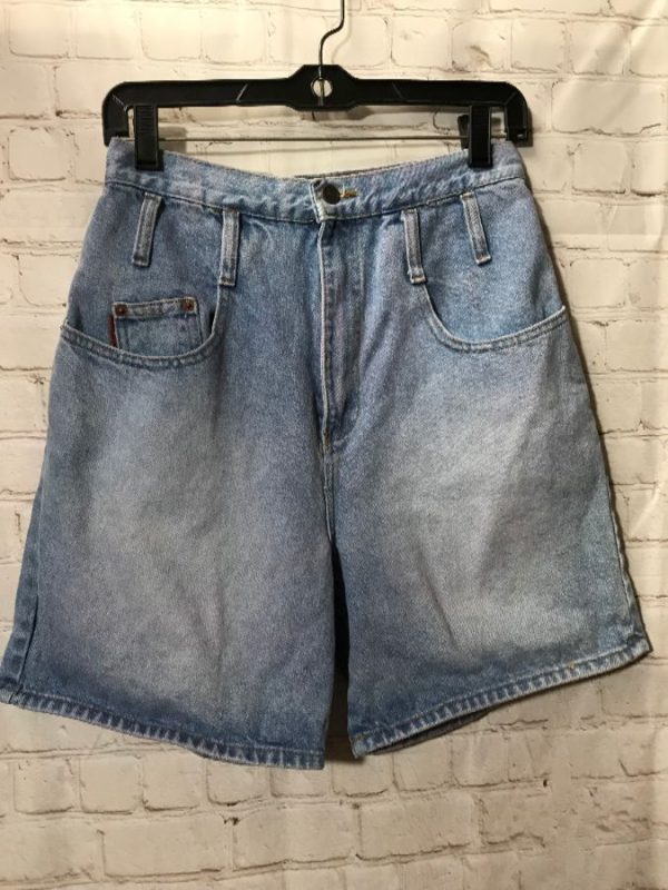 1980’s Lei denim shorts, hemmed long Bermuda length, pockets front & back, acid wash, medium blue, size 5