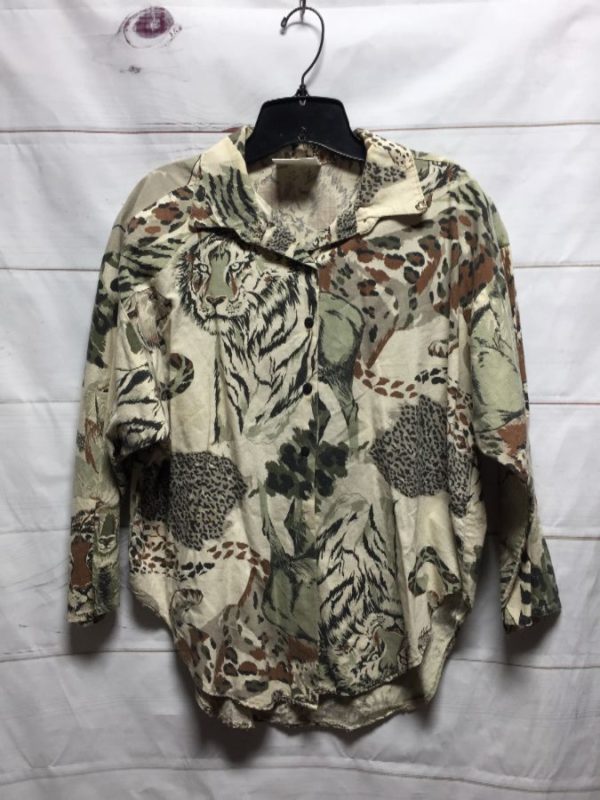 1980S MIXED SAFARI PRINT LONG SLEEVE BUTTON UP COTTON BLOUSE – AS IS
