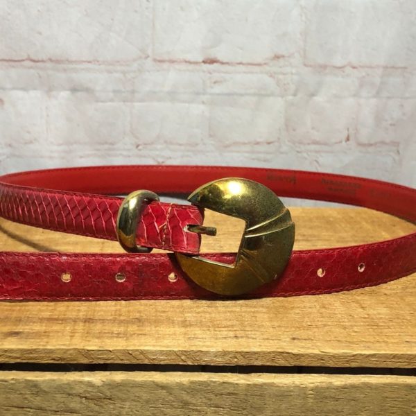 1980’s belt, leather, genuine snakeskin, narrow width, round solid brass buckle & loop, red/gold, size 27″ – 34″